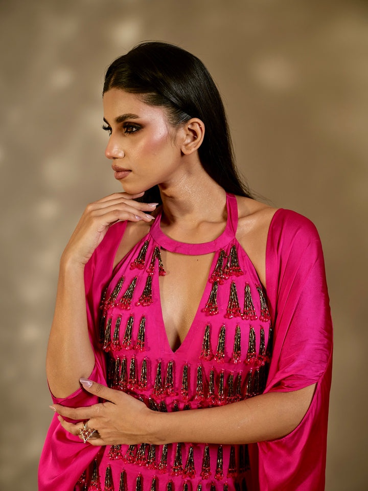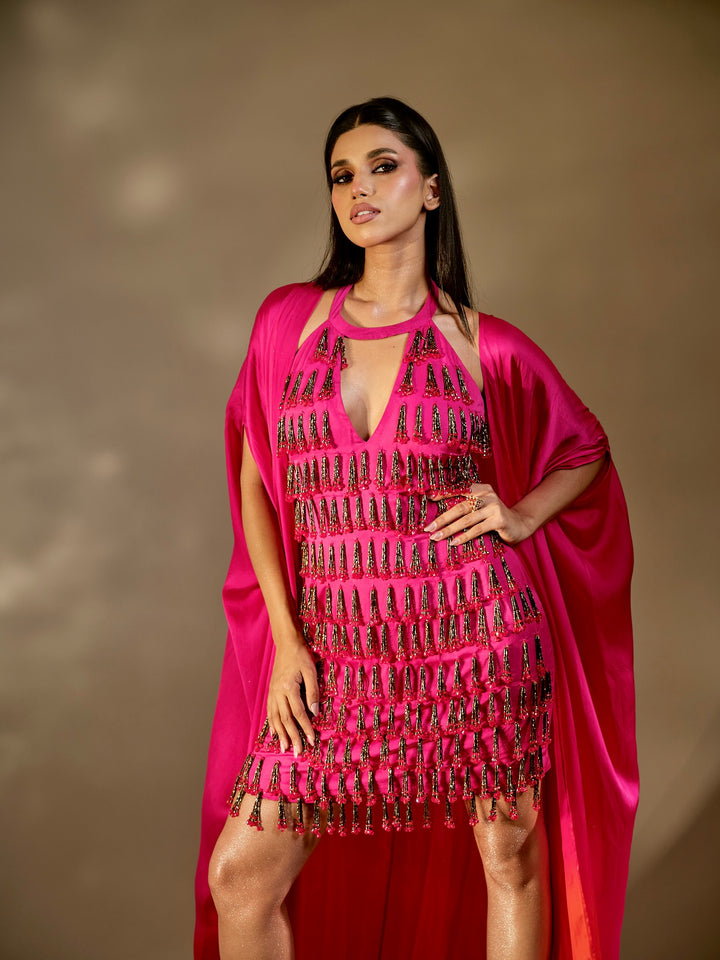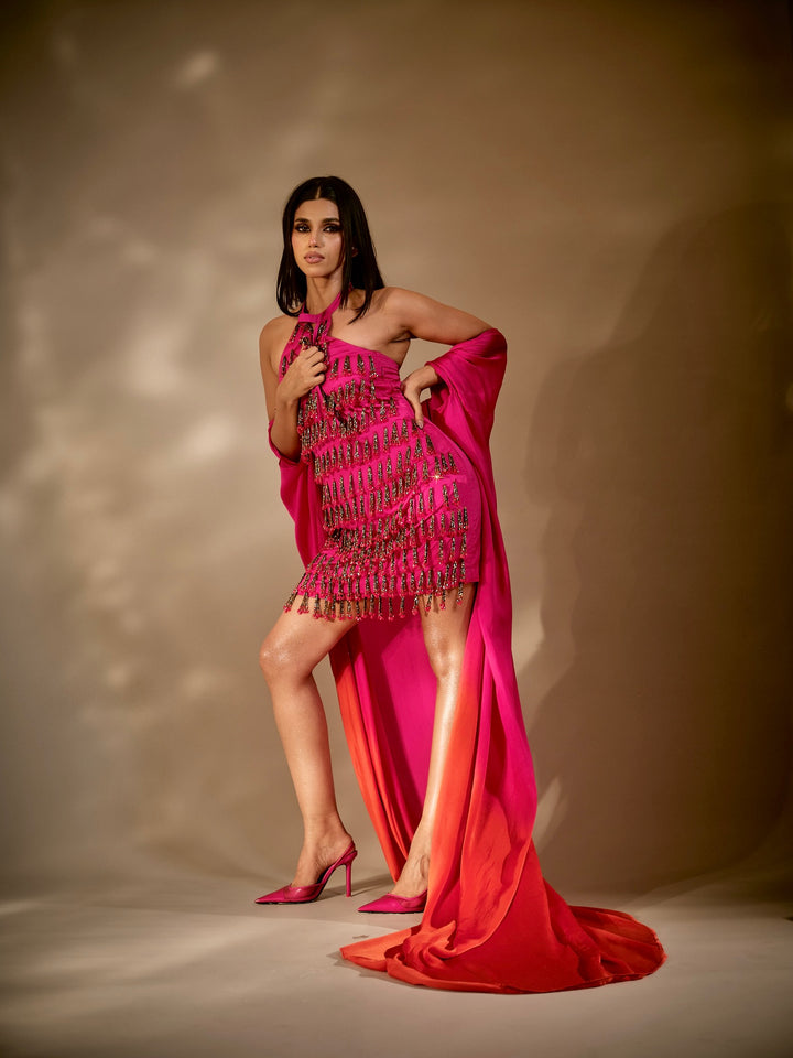 An ethereal piece from Suryast — where twilight meets divinity. Flowing, luminous, and regal, this silhouette drapes you in effortless beauty. The ombrés and solid tones capture the spiritual glow of sunset, while every detail whispers of royalty and grace. Paired with crystal accents that gleam like prayers in starlight, this outfit is designed to make you feel like the eternal goddess you are.