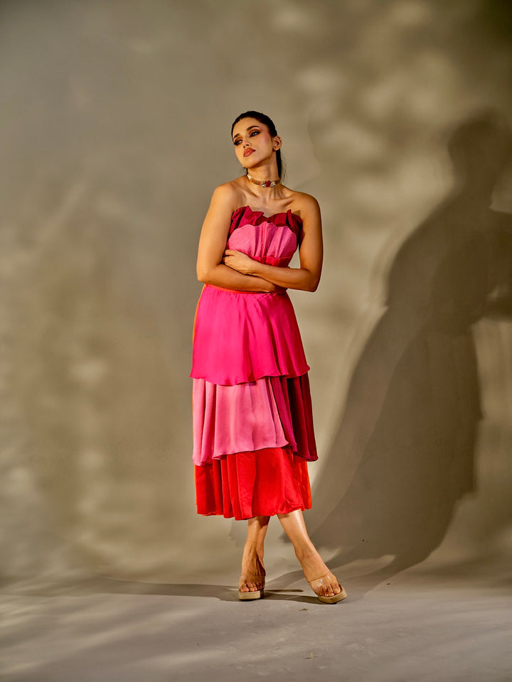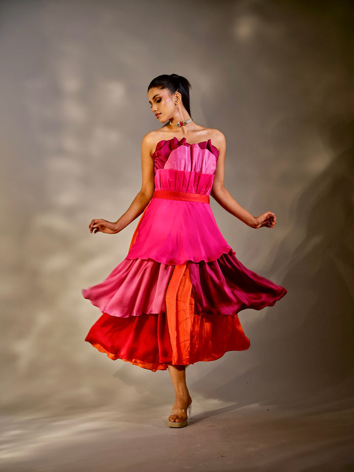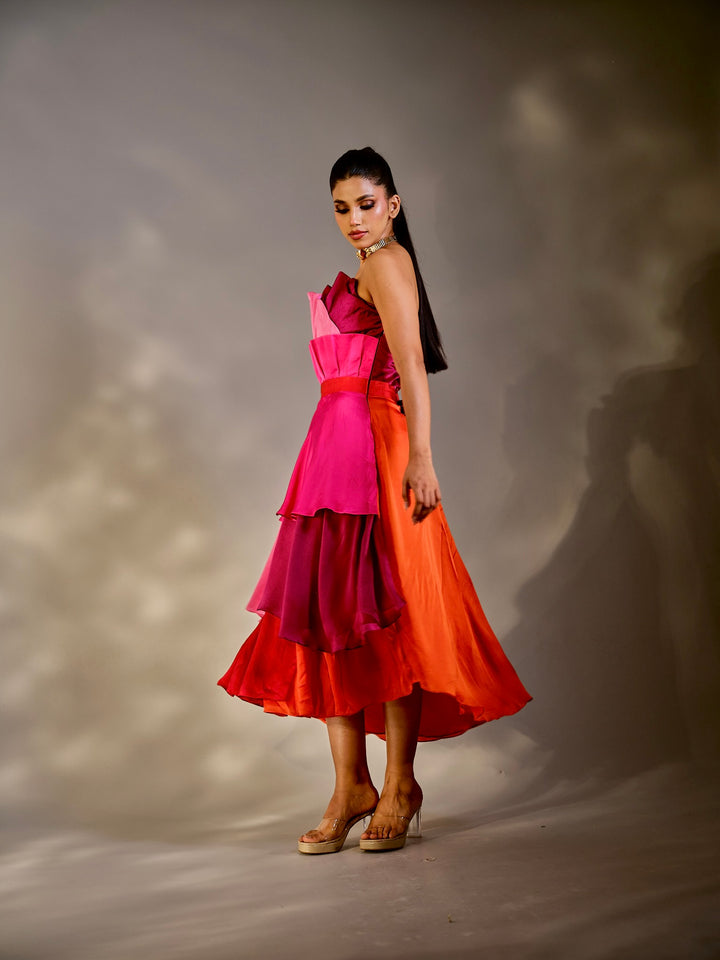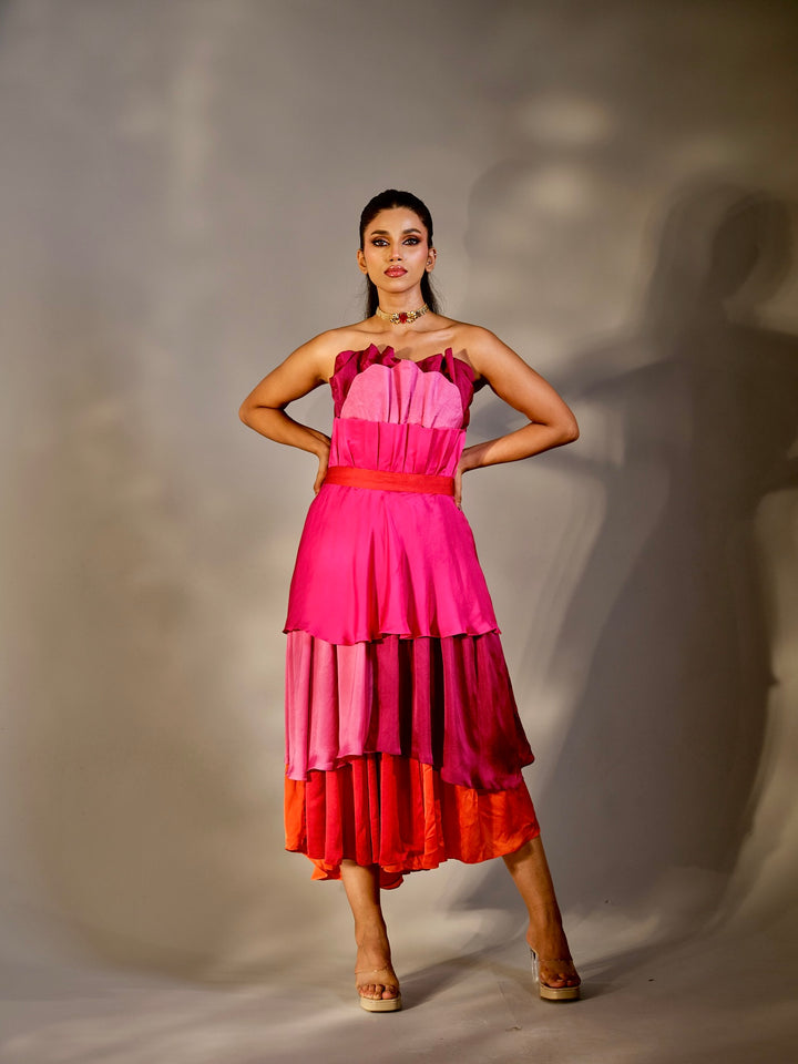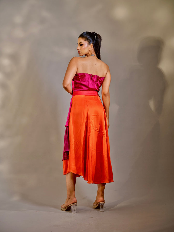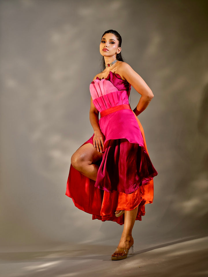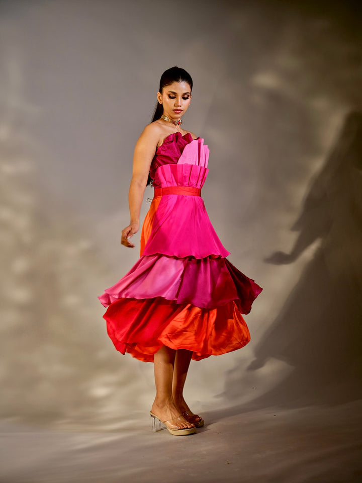 An ethereal piece from Suryast — where twilight meets divinity. Flowing, luminous, and regal, this silhouette drapes you in effortless beauty. The ombrés and solid tones capture the spiritual glow of sunset, while every detail whispers of royalty and grace. Paired with crystal accents that gleam like prayers in starlight, this outfit is designed to make you feel like the eternal goddess you are.