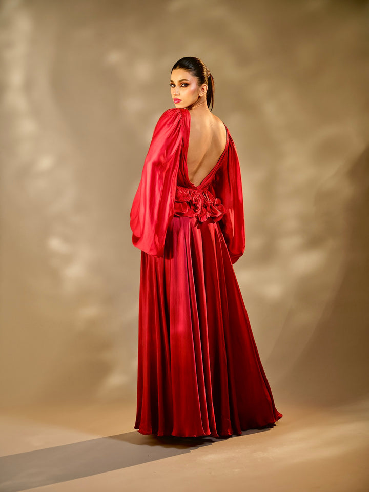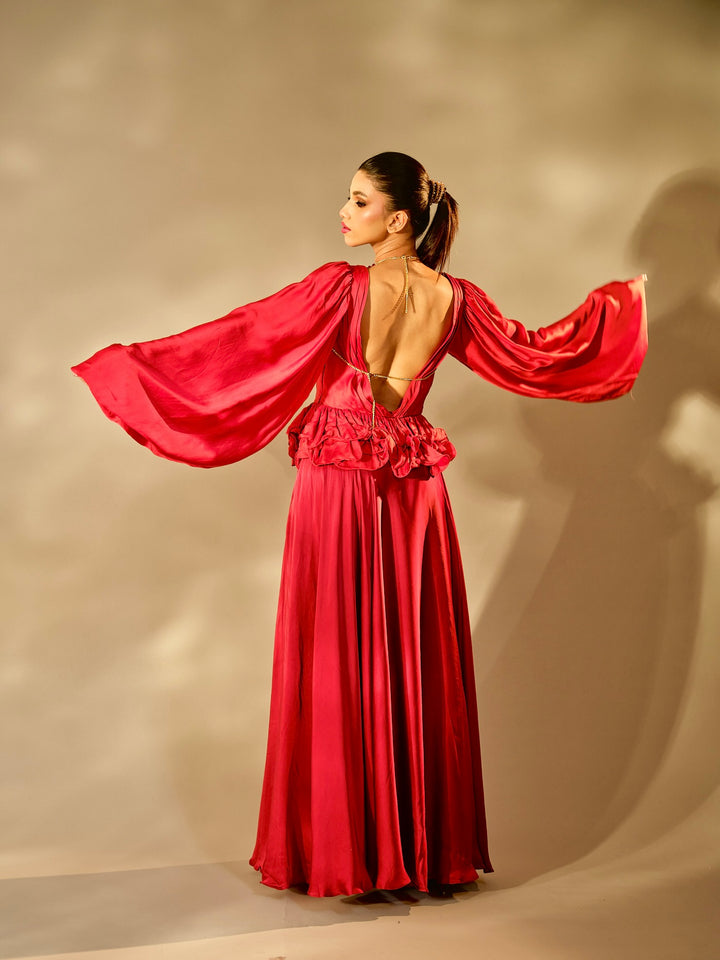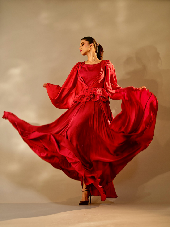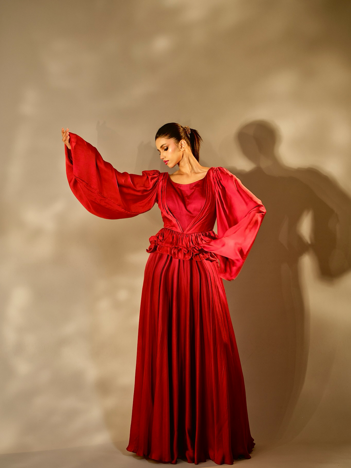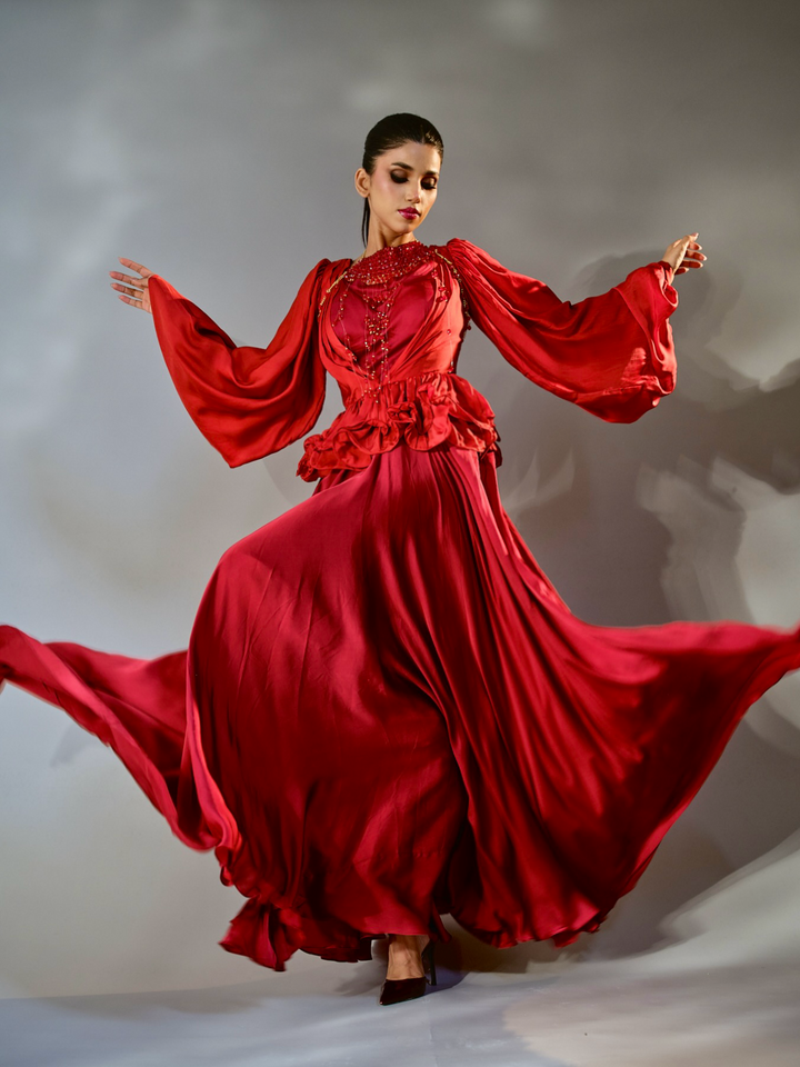 An ethereal piece from Suryast — where twilight meets divinity. Flowing, luminous, and regal, this silhouette drapes you in effortless beauty. The ombrés and solid tones capture the spiritual glow of sunset, while every detail whispers of royalty and grace. Paired with crystal accents that gleam like prayers in starlight, this outfit is designed to make you feel like the eternal goddess you are.