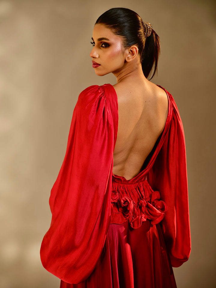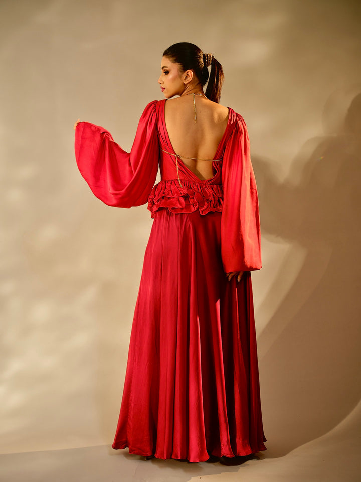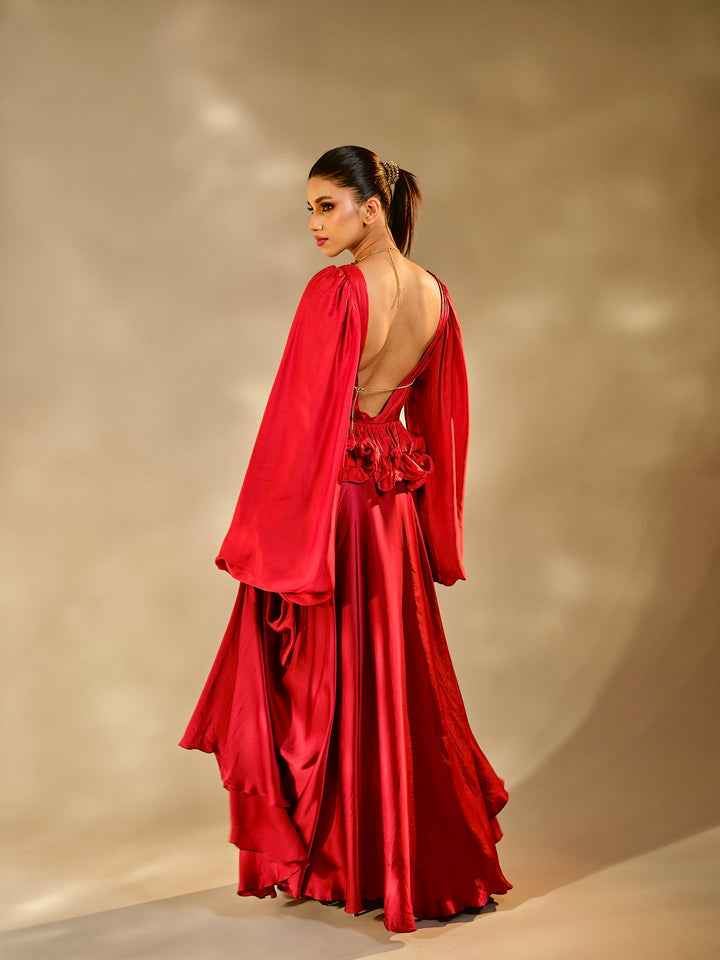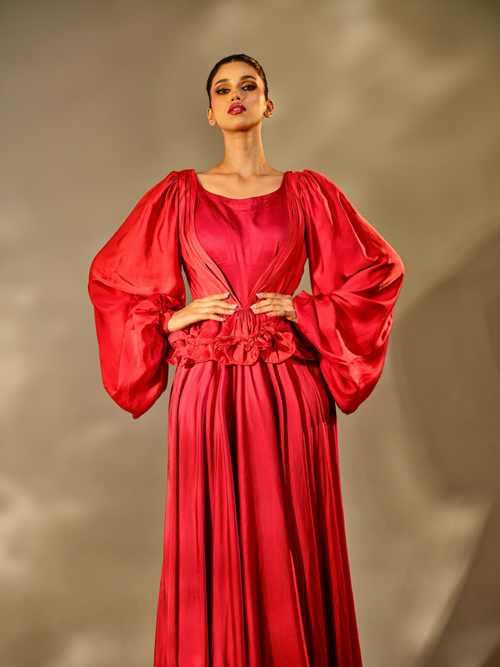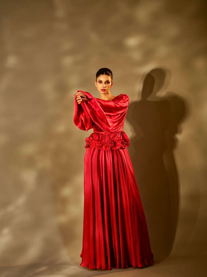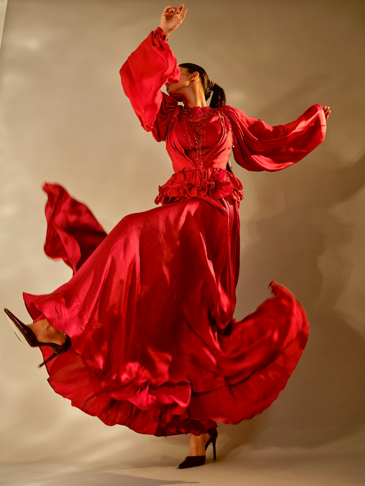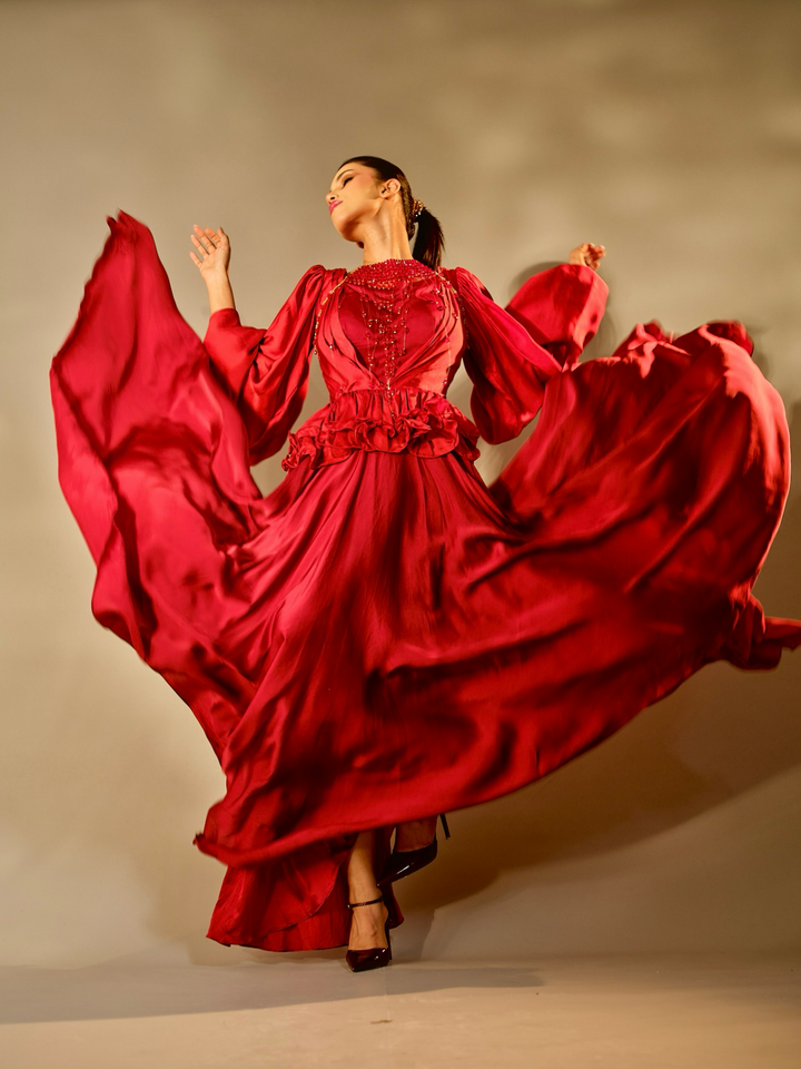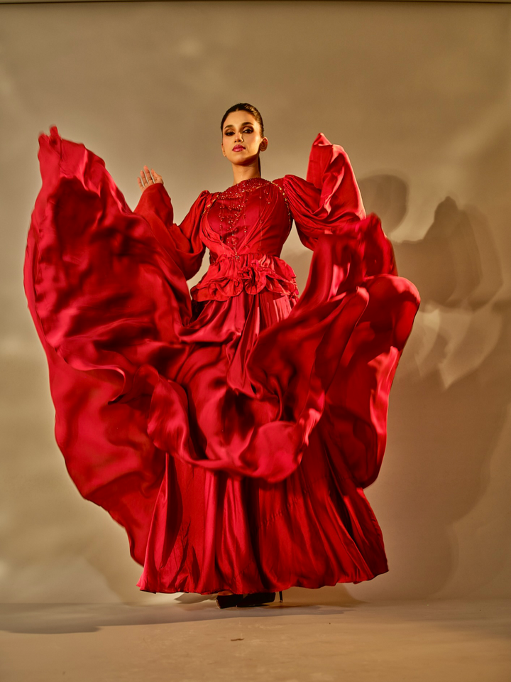 An ethereal piece from Suryast — where twilight meets divinity. Flowing, luminous, and regal, this silhouette drapes you in effortless beauty. The ombrés and solid tones capture the spiritual glow of sunset, while every detail whispers of royalty and grace. Paired with crystal accents that gleam like prayers in starlight, this outfit is designed to make you feel like the eternal goddess you are.