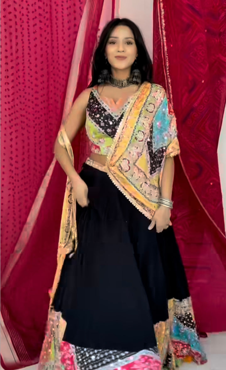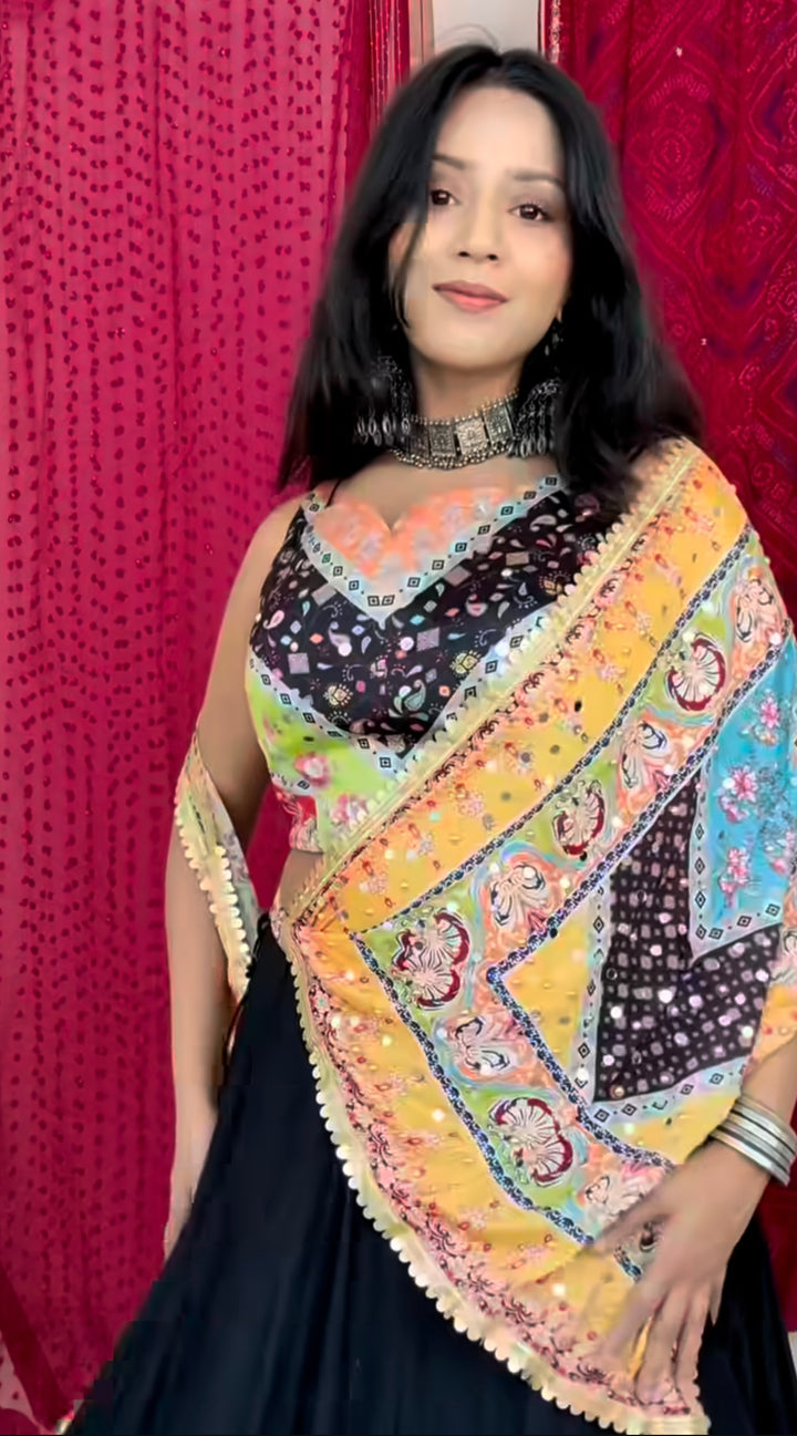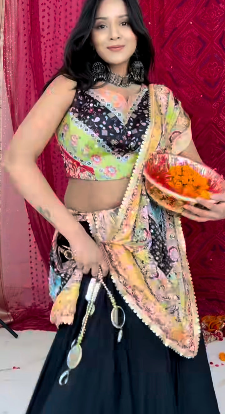 Introducing Lalasa from the Kātyāyana Collection, signifying 'desire' or 'longing' – an embodiment of divine grace and regal elegance. This ensemble includes a blouse, lehenga skirt, and dupatta, each meticulously crafted from luxurious black crepe. Adorned with vibrant, cosmic-inspired prints and intricate mirror work, the Aarya set drapes like a goddess's cloak, whispering tales of power and grace. Designed for the modern deity, Aarya empowers you to walk with confidence and radiate the beauty and strength of the goddess within at any grand event.