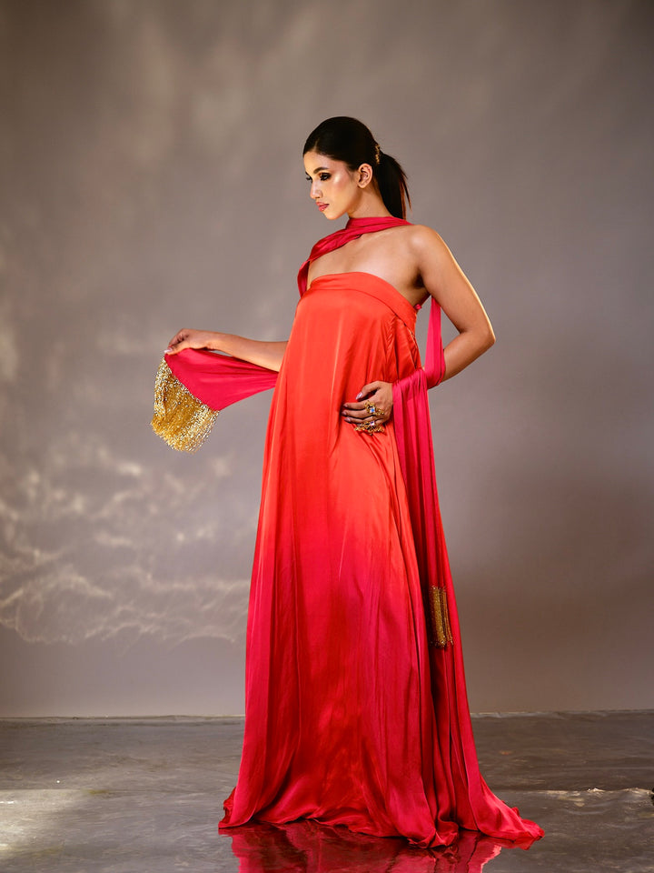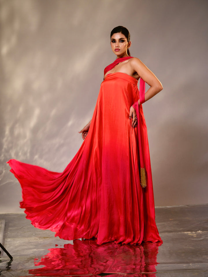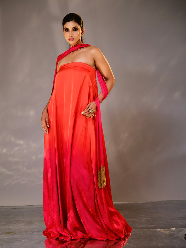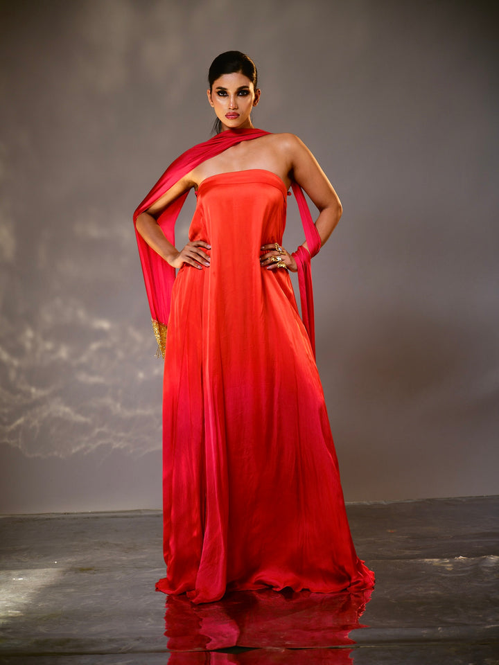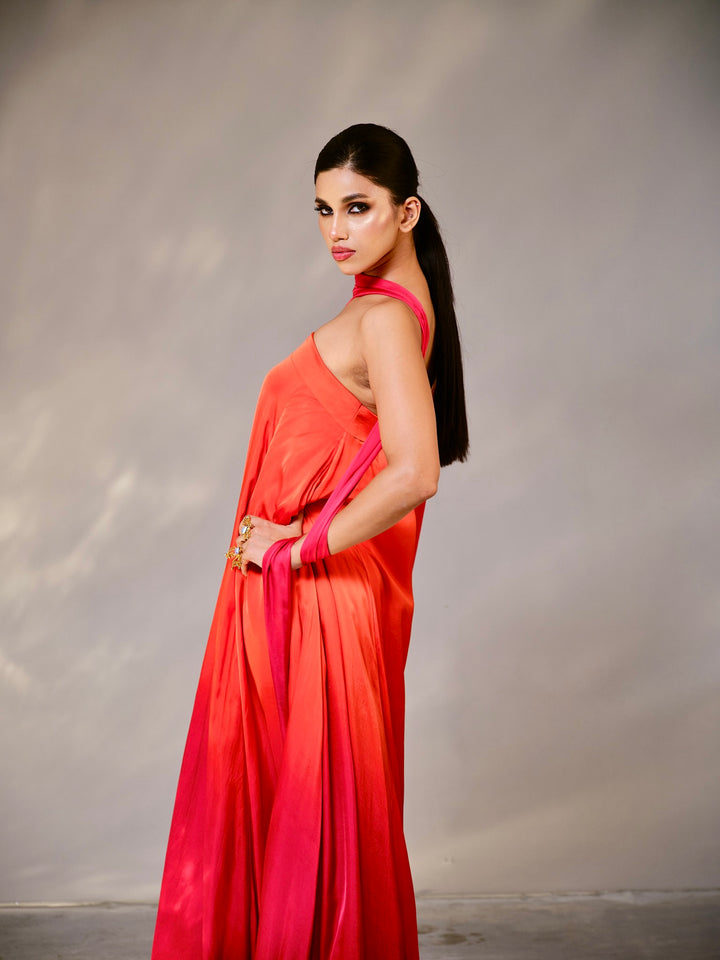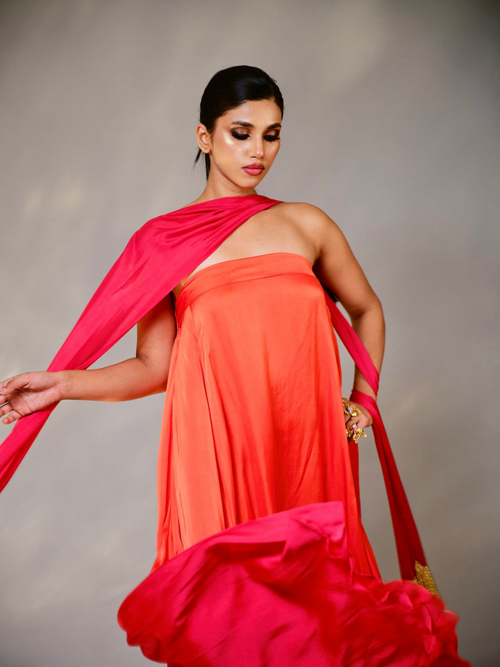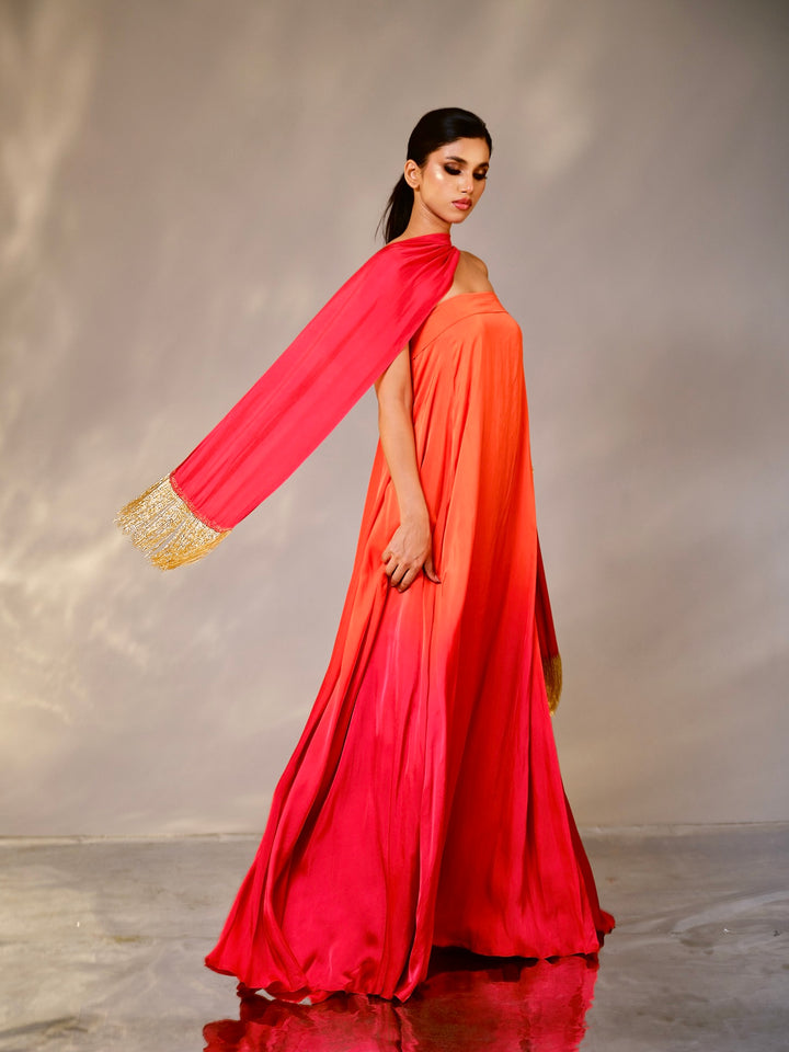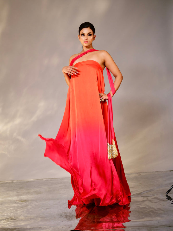 An ethereal piece from Suryast — where twilight meets divinity. Flowing, luminous, and regal, this silhouette drapes you in effortless beauty. The ombrés and solid tones capture the spiritual glow of sunset, while every detail whispers of royalty and grace. Paired with crystal accents that gleam like prayers in starlight, this outfit is designed to make you feel like the eternal goddess you are.