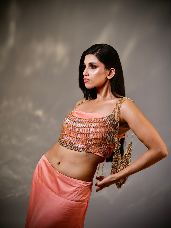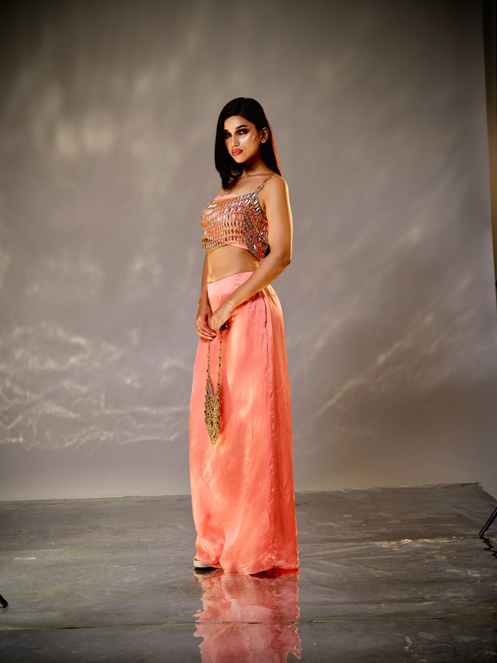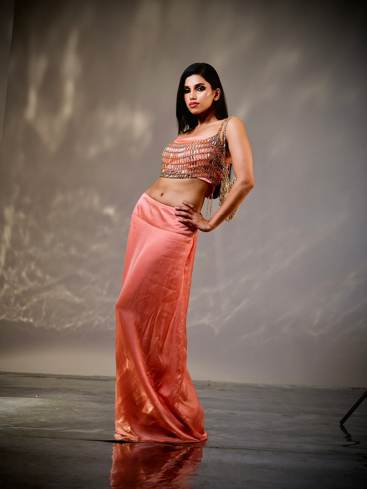 An ethereal piece from Suryast — where twilight meets divinity. Flowing, luminous, and regal, this silhouette drapes you in effortless beauty. The ombrés and solid tones capture the spiritual glow of sunset, while every detail whispers of royalty and grace. Paired with crystal accents that gleam like prayers in starlight, this outfit is designed to make you feel like the eternal goddess you are.