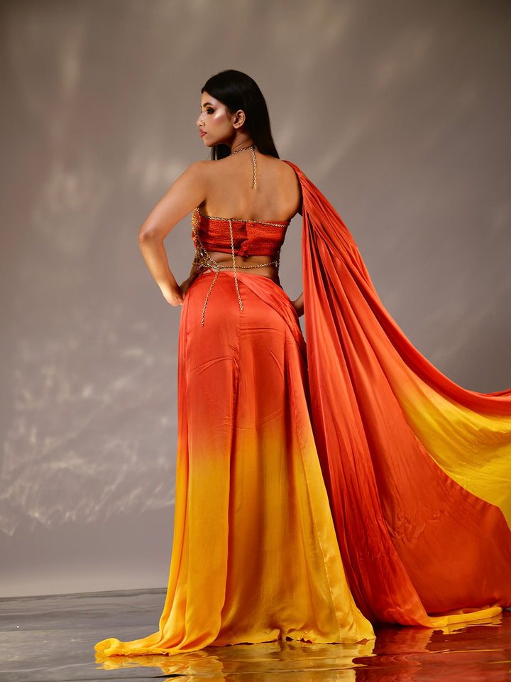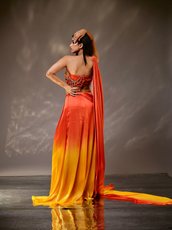 An ethereal piece from Suryast — where twilight meets divinity. Flowing, luminous, and regal, this silhouette drapes you in effortless beauty. The ombrés and solid tones capture the spiritual glow of sunset, while every detail whispers of royalty and grace. Paired with crystal accents that gleam like prayers in starlight, this outfit is designed to make you feel like the eternal goddess you are.