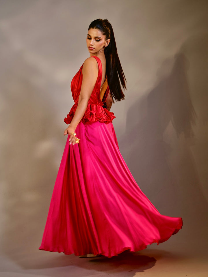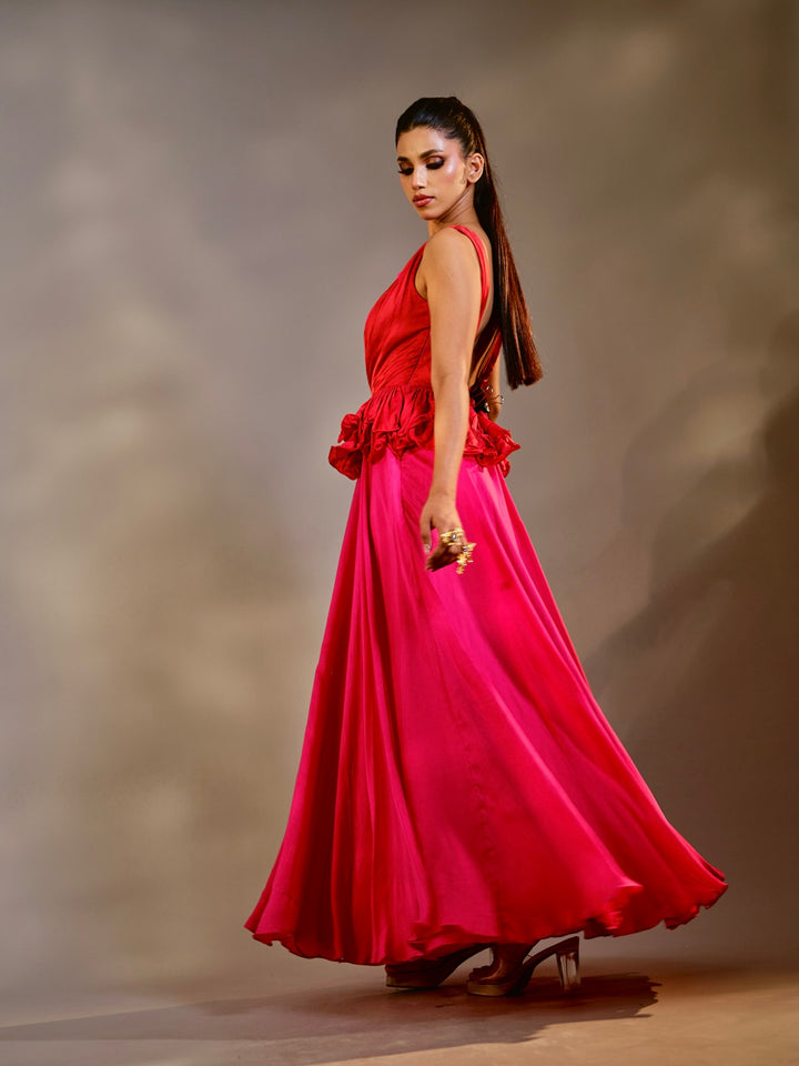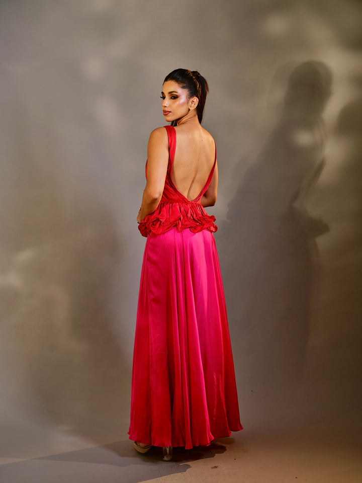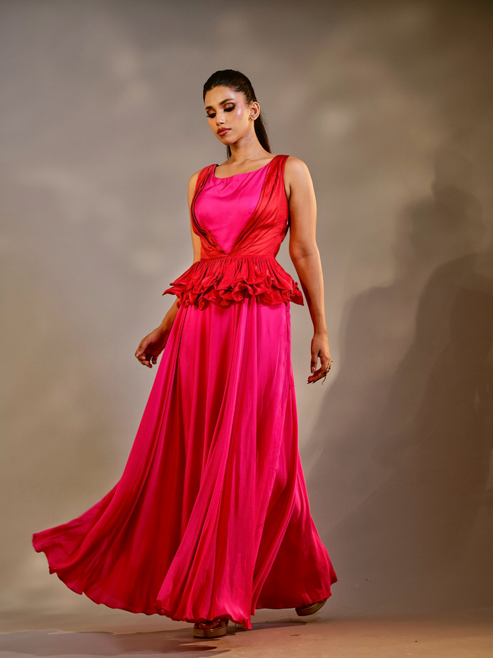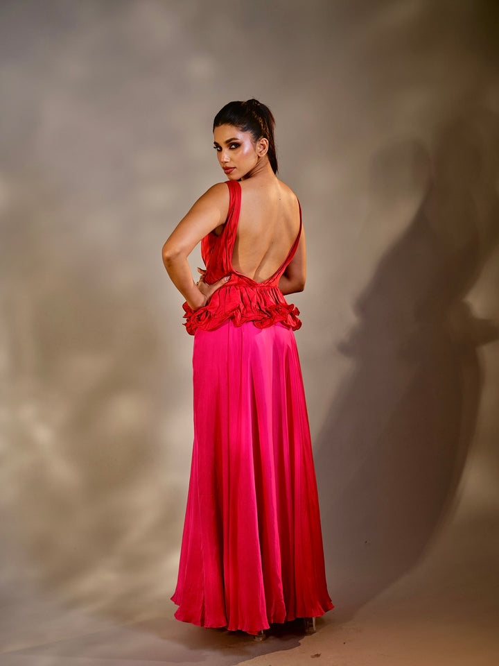 An ethereal piece from Suryast — where twilight meets divinity. Flowing, luminous, and regal, this silhouette drapes you in effortless beauty. The ombrés and solid tones capture the spiritual glow of sunset, while every detail whispers of royalty and grace. Paired with crystal accents that gleam like prayers in starlight, this outfit is designed to make you feel like the eternal goddess you are.