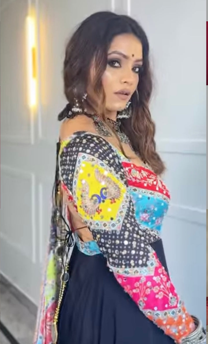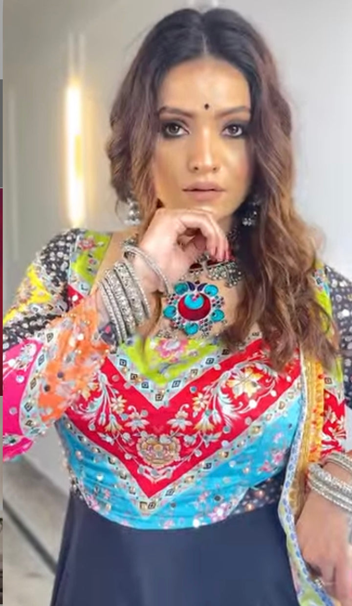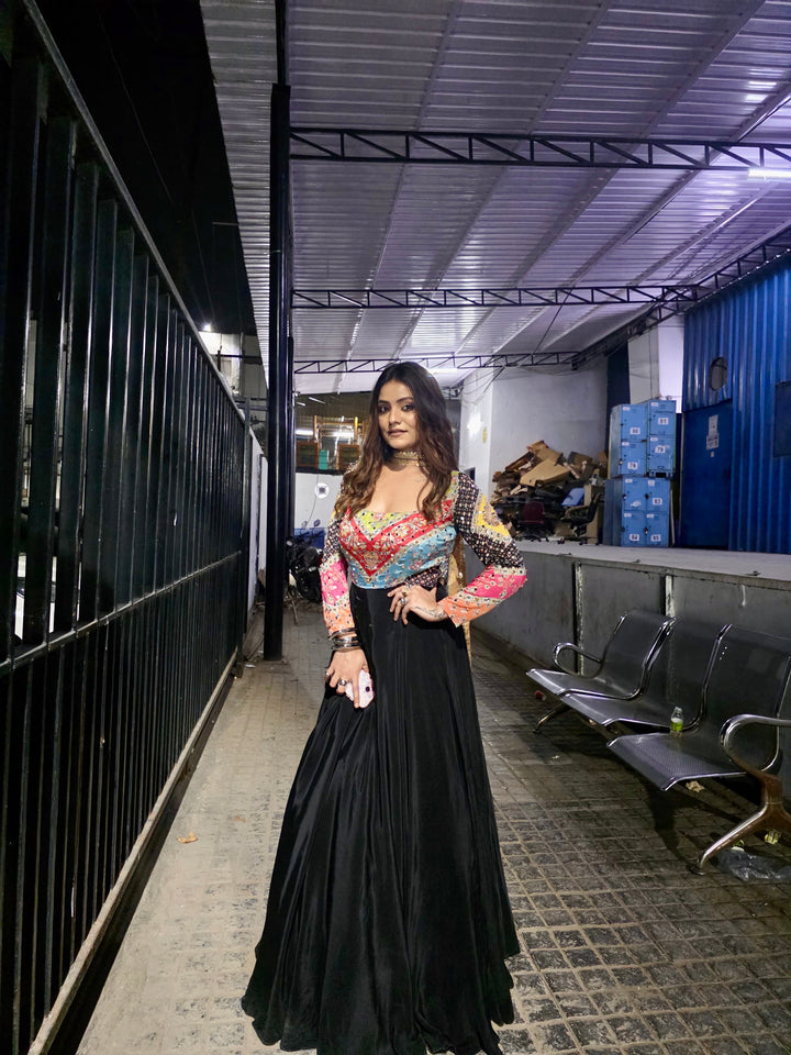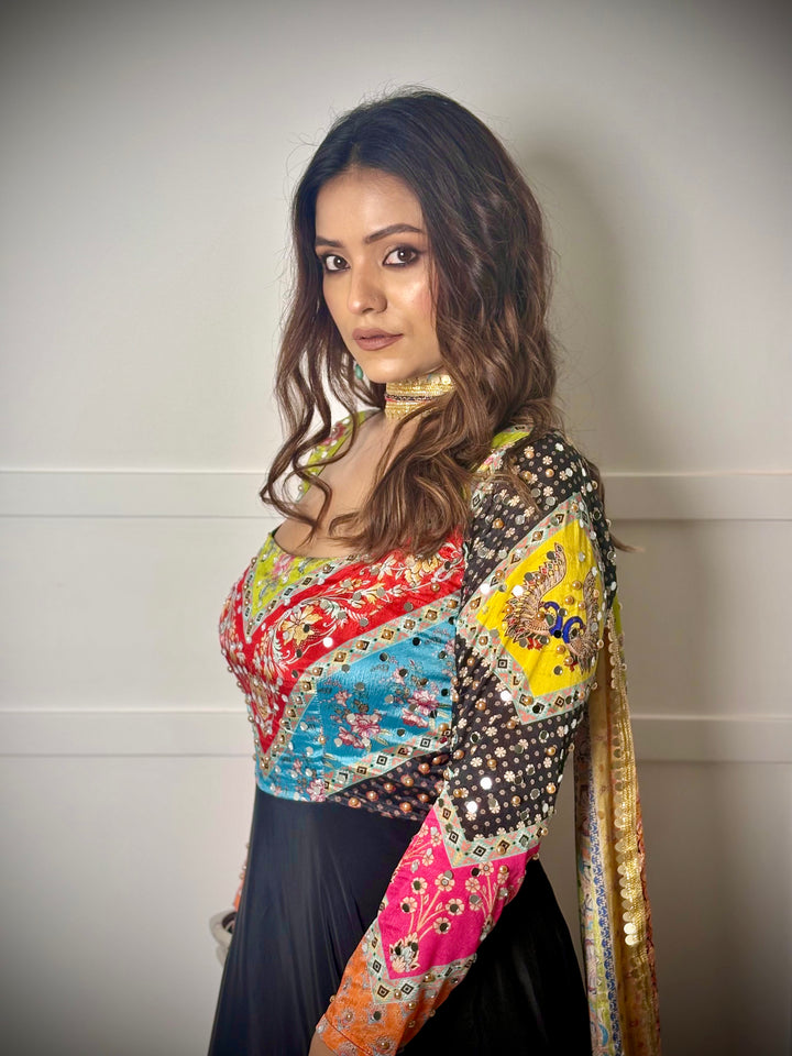 Introducing Aarya from the Kātyāyana Collection, signifying 'the goddess' – an embodiment of divine grace and regal elegance. This ensemble includes an Anarkali, dupatta, and churidar, each meticulously crafted from luxurious black crepe. Adorned with vibrant, cosmic-inspired prints and intricate mirror work, the Aarya set drapes like a goddess's cloak, whispering tales of power and grace. Designed for the modern deity, Aarya empowers you to walk with confidence and radiate the beauty and strength of the goddess within at any grand event.